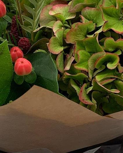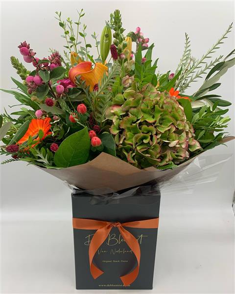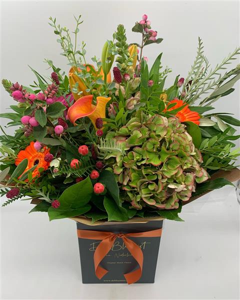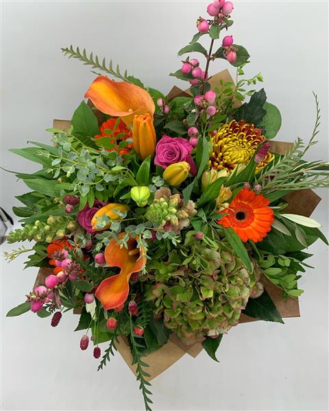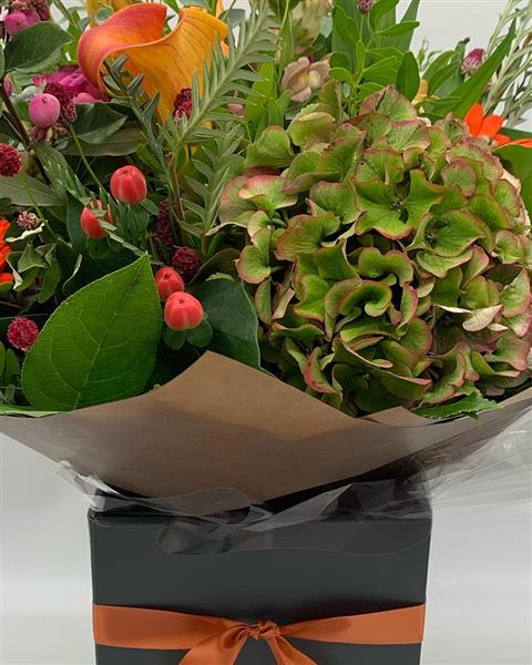 This is a vibrant autumn-inspired mix, a bold seasonal medley with hydrangea, berries, orange calla and gerbera—perfect for warming someone’s day with colour and charm.