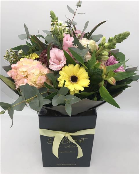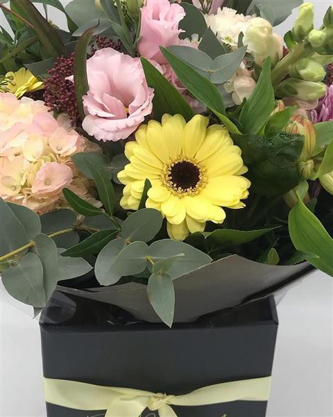 Bright and breezy with soft hydrangea, pastel lisianthus, yellow germini and touches of eucalyptus, this bouquet brings a cheerful glow to any space. Beautifully presented in our signature gift box.
