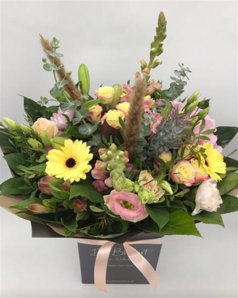 A soft countryside blend gift box design from our signature collection with lisianthus, yellow germini, snapdragons, roses and dried grasses – a meadow-inspired arrangement full of gentle charm. We design our own beautiful bouquets using the freshest flowers, direct local flower delivery just for you.