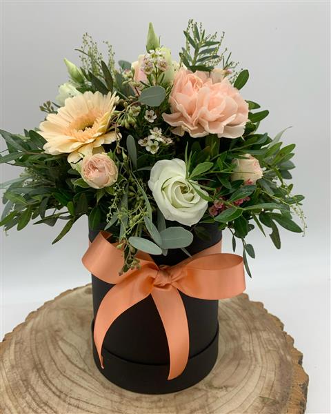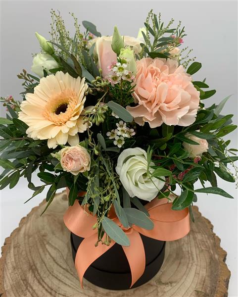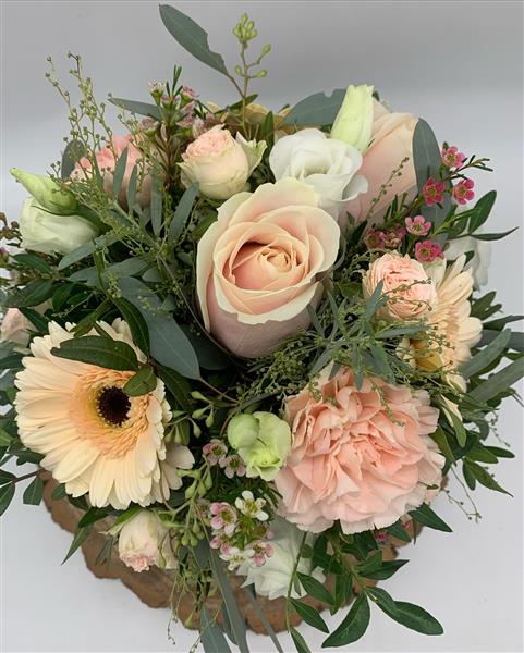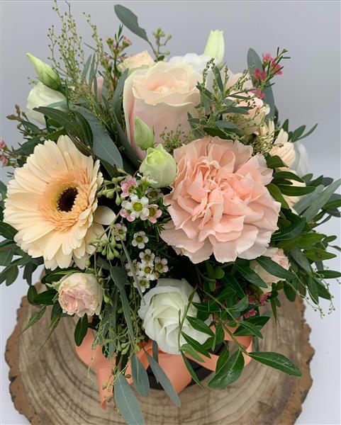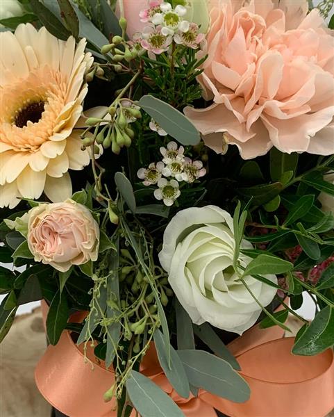 This is a soft dreamy arrangement, soft peach blooms, creamy roses and pretty gerberas create a gentle, romantic display finished with lush foliage and a satin bow.