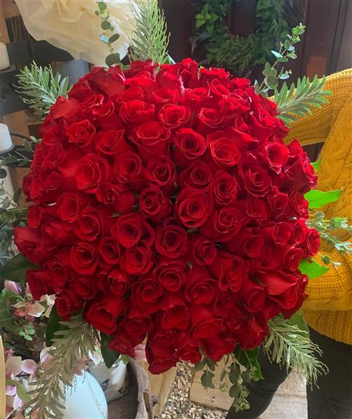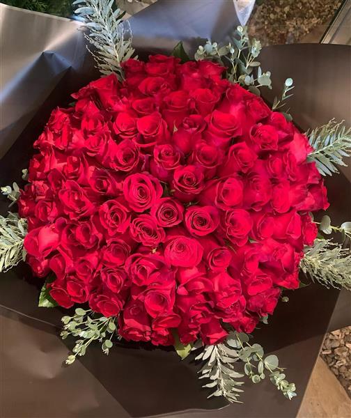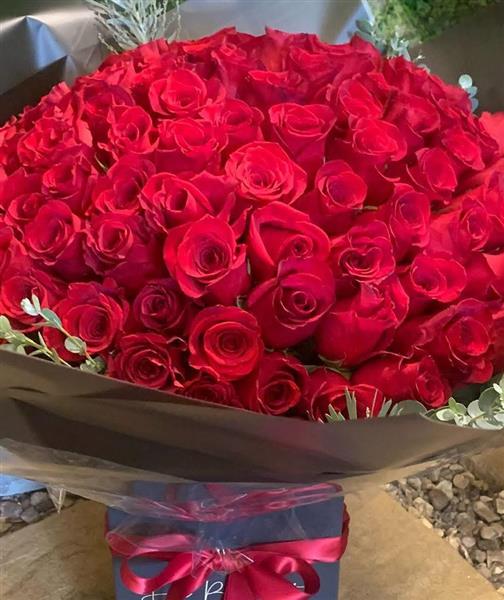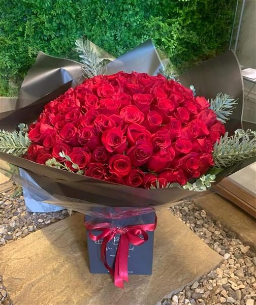 100 velvety red roses, all perfectly open and ready to wow. Packed with passion, this luxury hand-tied is the ultimate romantic gesture.