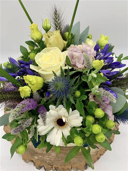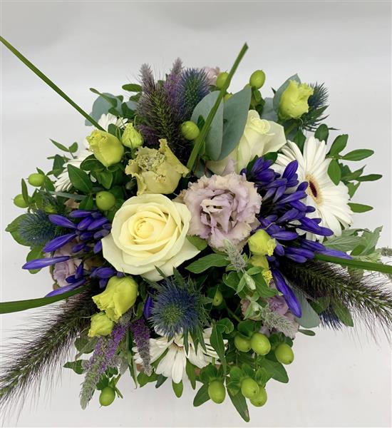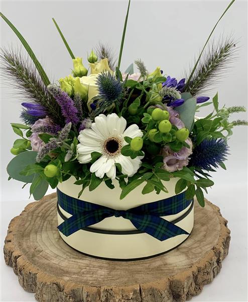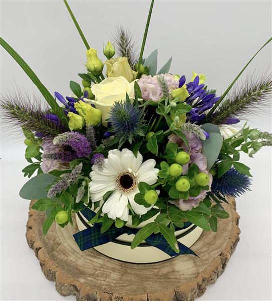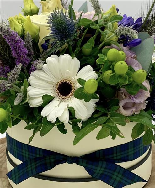 Soft cream blooms meet cooling lilac tones and spiky thistles in this charming hatbox design, finished with a fresh touch of green and grasses.