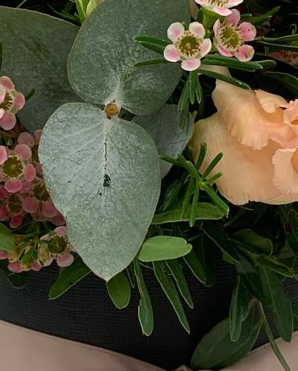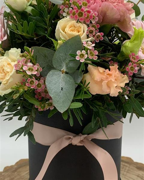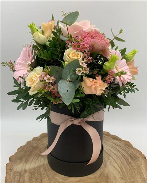 Delicate pinks and soft creams mingle beautifully in this elegant design, finished in a stylish hatbox tied with blush satin. We design our own beautiful bouquets using the freshest flowers, direct local flower delivery just for you.