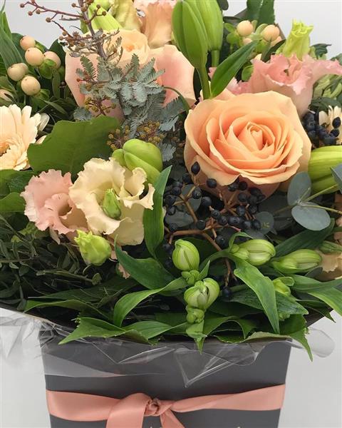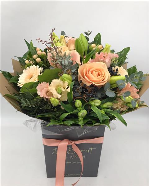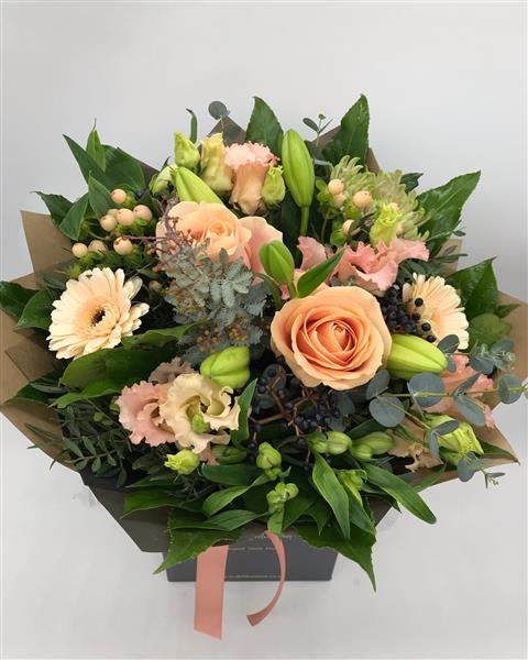 This one's a beauty, such a warm, soft and elegant mix with those gorgeous peachy tones! Soft apricot and peach blooms, paired with creamy flowers and fresh foliage, create a wonderfully warm and uplifting gift.