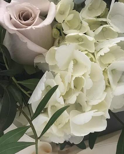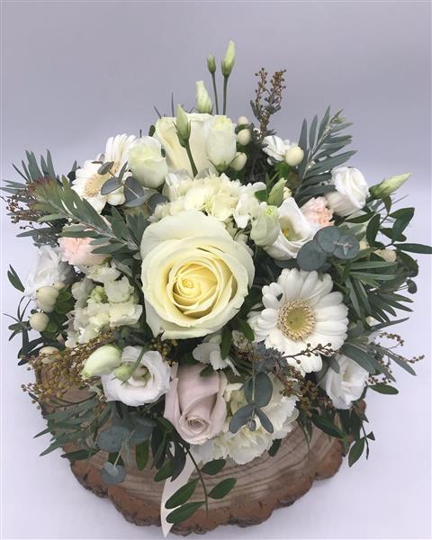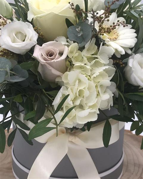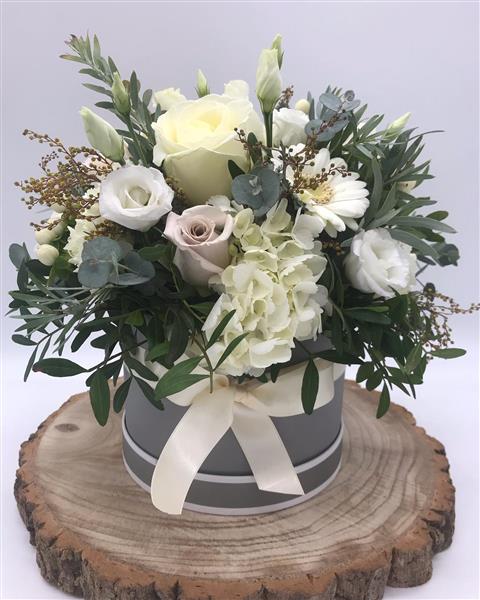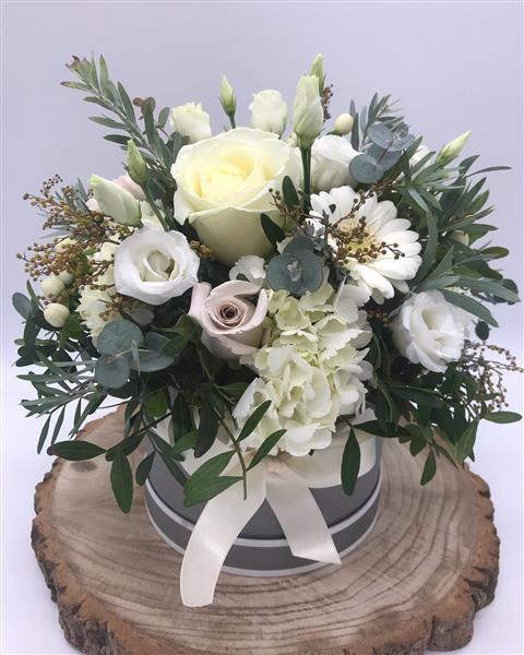 This one is beautifully serene, cool white hydrangeas, creamy roses and soft eucalyptus give it a calm, classic feel in a stylish hatbox. Classic white blooms with soft textures and subtle foliage—an elegant design full of natural beauty.