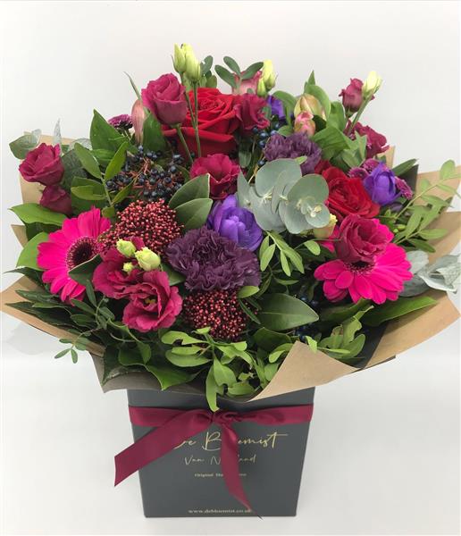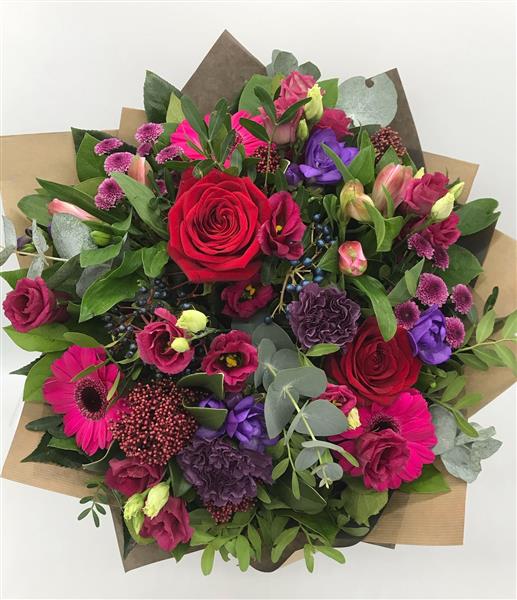 This one's bursting with deep berry tones, velvety purples, and rich magenta, a bold and luxurious mix that really grabs attention! A striking hand-tied bouquet filled with lush berry shades and vibrant purples. Designed to impress with every delivery.