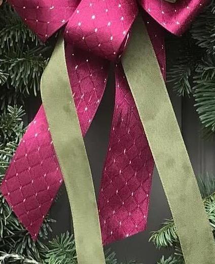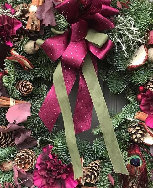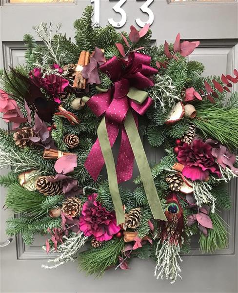 A luxurious winter wreath featuring burgundy tones, pinecones, cinnamon sticks, and peacock feather highlights. Designed to impress and rich in festive detail.