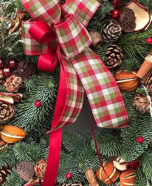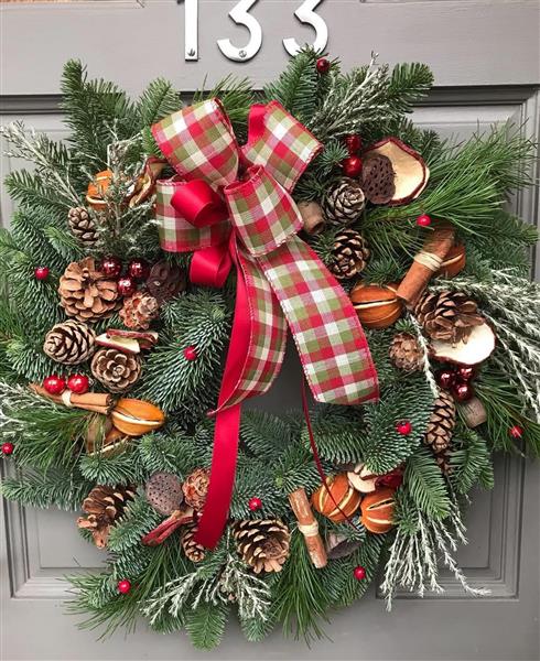 Bursting with festive cheer, this wreath blends fragrant cinnamon, dried citrus, pinecones, and classic tartan ribbon. A warm welcome for any door.