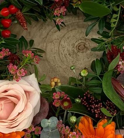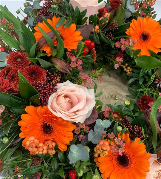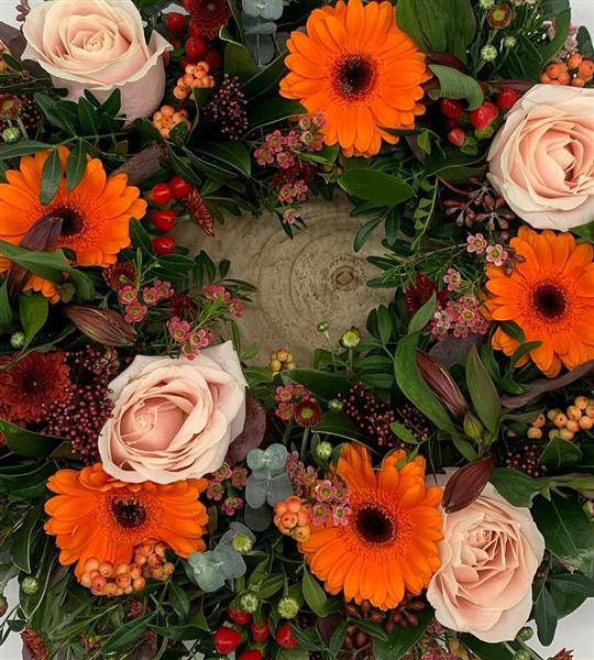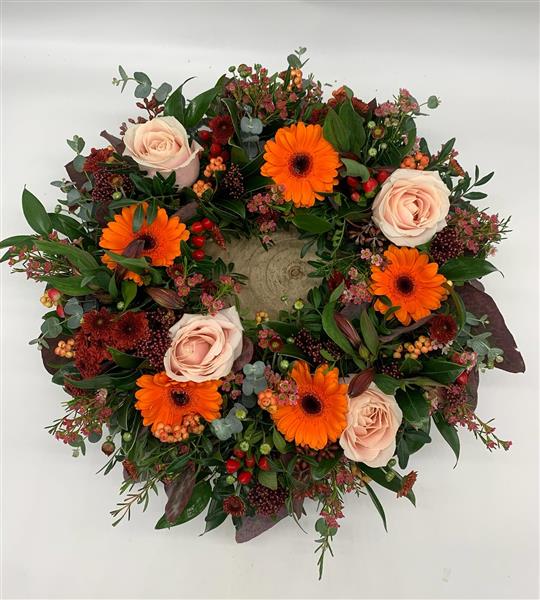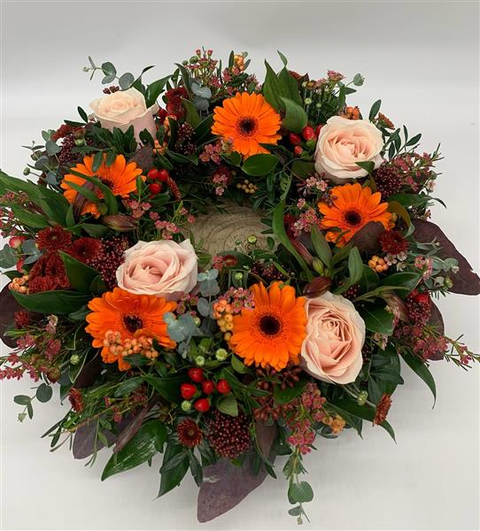 Rich circular wreath on moisture-retaining foam, blooming with bright orange gerbera daisies, soft blush garden roses, deep-burgundy spray chrysanthemums, red hypericum berries and delicate waxflower, all woven through an array of mixed foliage for a warm, autumnal tribute.
