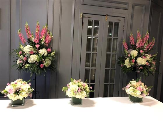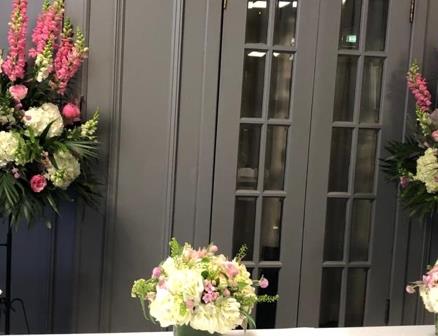 Pink and white pedestal church arrangement elegant and heartfelt setting for services or special occasions.