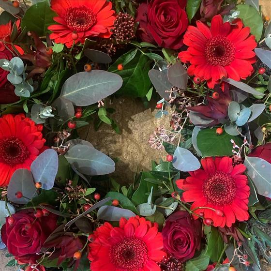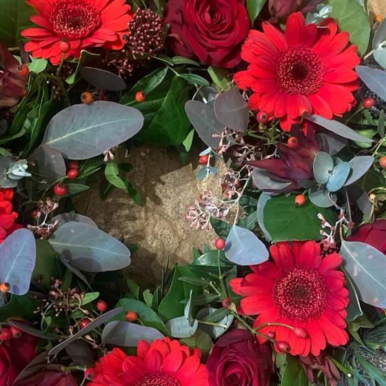 Elegant circular wreath mounted on moisture-retaining foam, featuring scarlet gerbera daisies, deep red roses, vibrant red hypericum berries and lush skimmia clusters, all intertwined with silvery eucalyptus and rich mixed foliage for a dignified, heartfelt tribute.
