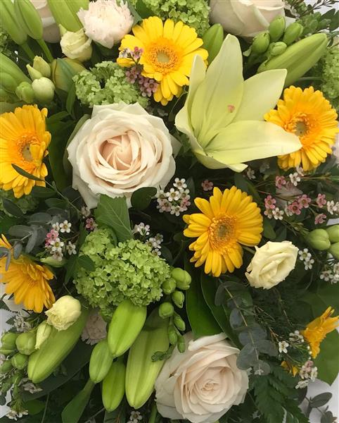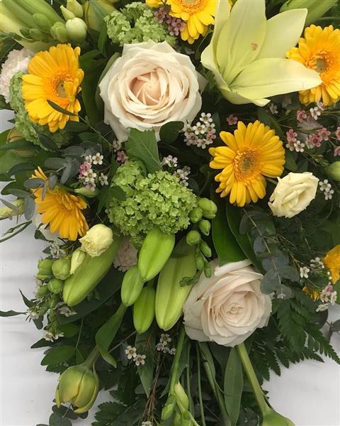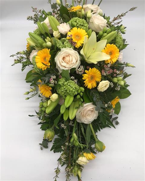 Soft yellow roses, gerberas and lilies rest among gentle green viburnum and foliage in a graceful teardrop, to honour a life dearly missed.
