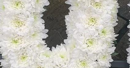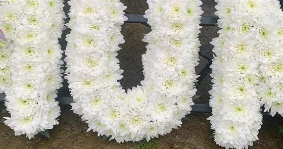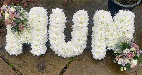 White Chrysanthemum “MUM” Letter Tribute: hand-crafted letters M-U-M formed from densely packed white chrysanthemum blooms on a frame, accented at each end with mauve roses, white lisianthus, lavender clematis, pink statice and eucalyptus foliage.