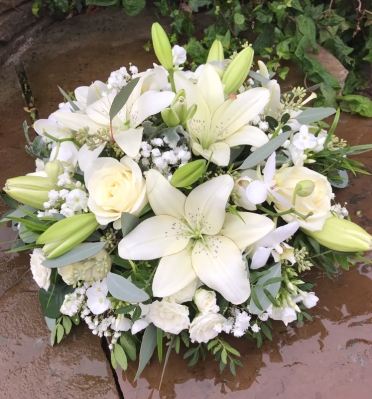 Soft white lilies and roses nestled among tender foliage, crafted to honour a cherished memory.