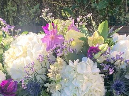 A gentle casket spray to honour a loved one. White hydrangeas and lisianthus symbolise purity; purple lisianthus and blue thistle convey quiet dignity. Eucalyptus and clematis tendrils form a respectful cascade over the casket. Heartfelt sympathy during this farewell.
