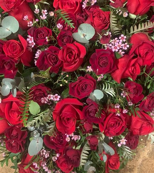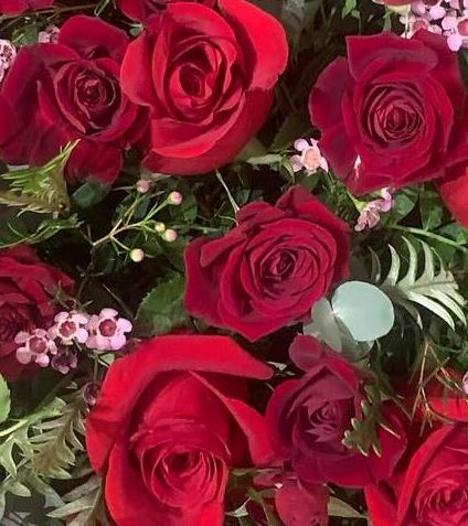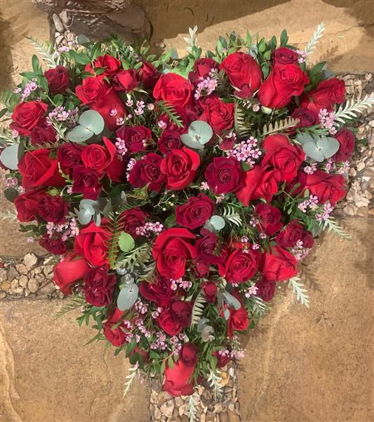 Ruby Rose & Waxflower Funeral Heart Tribute, hand-crafted on a heart-shaped foam base with red roses, pink waxflower, eucalyptus and mixed greenery.