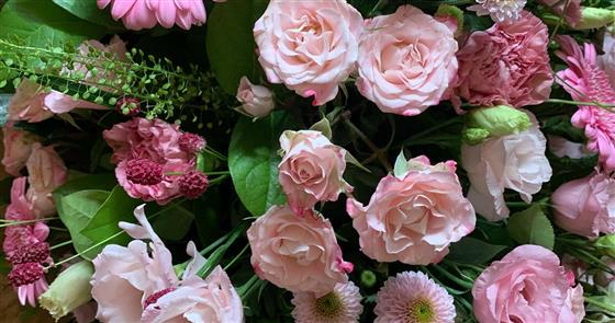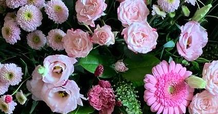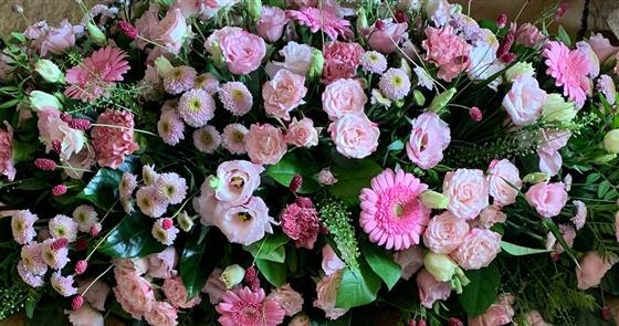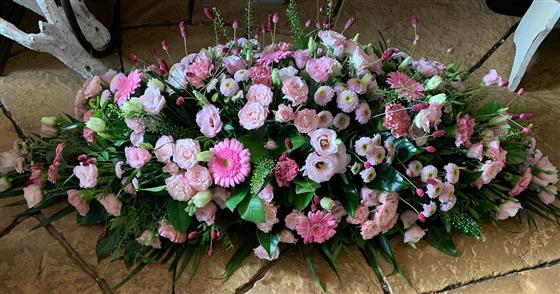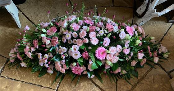 Delicate pale pink roses, spray carnations and gerberas rest upon soft greenery, arranged to honour a cherished life.