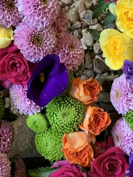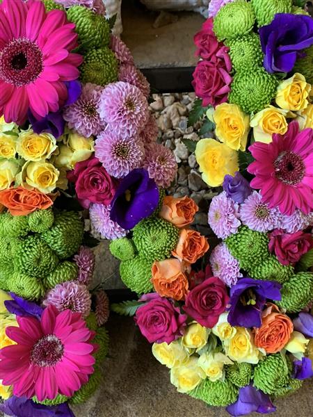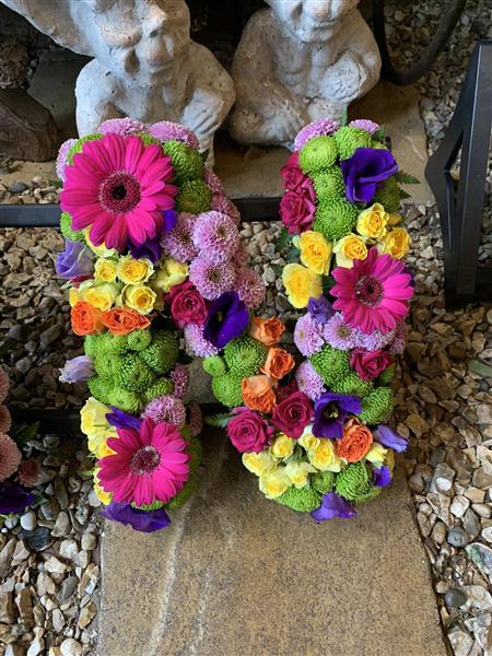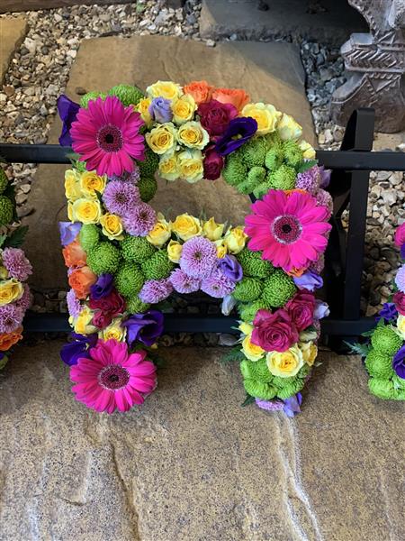 Custom Vibrant Mixed Bloom Letter Funeral Tribute hand-crafted individual letters on a frame, densely arranged with hot-pink gerbera daisies, lime-green button chrysanthemums, lilac spray chrysanthemums, yellow and orange spray roses, purple lisianthus and mixed greenery. Ideal for spelling any name or message.