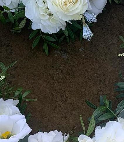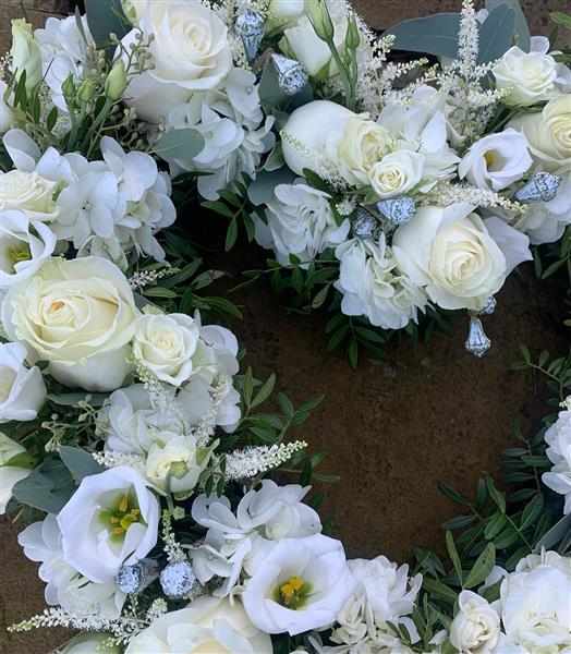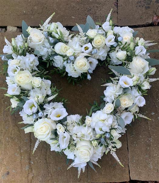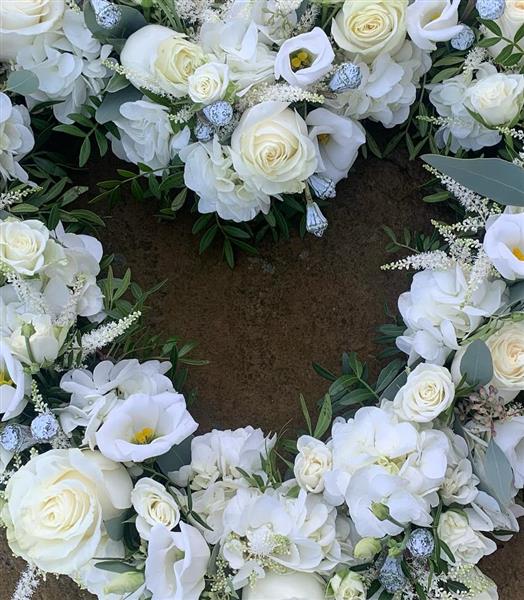 White & Silver Floral Funeral Heart Wreath hand-crafted on a heart-shaped foam base with white roses, hydrangea clusters, lisianthus, feathery astilbe and silver brunia, finished with eucalyptus foliage.