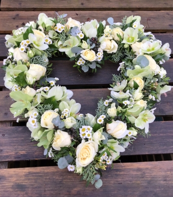 A tender heart shaped funeral tribute filled with creamy white roses, delicate blooms, and soft greenery, offering a beautiful symbol of love and remembrance.